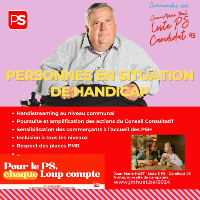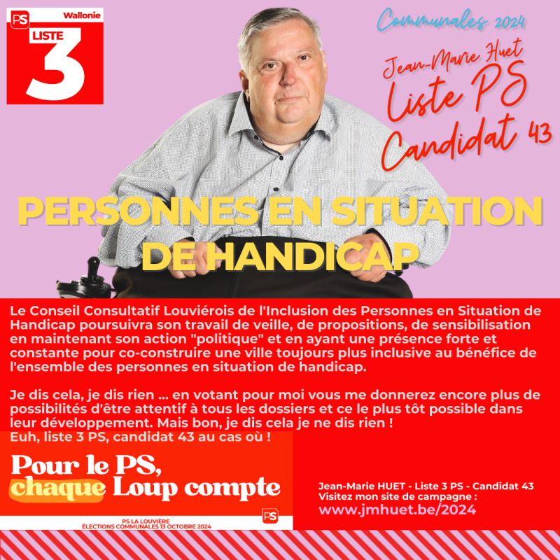 En ce qui concerne l'inclusion des personnes en situation de handicap : à La Louvière, il existe un Conseil Consultatif depuis très longtemps (j'ai l'honneur et le plaisir de le présider).