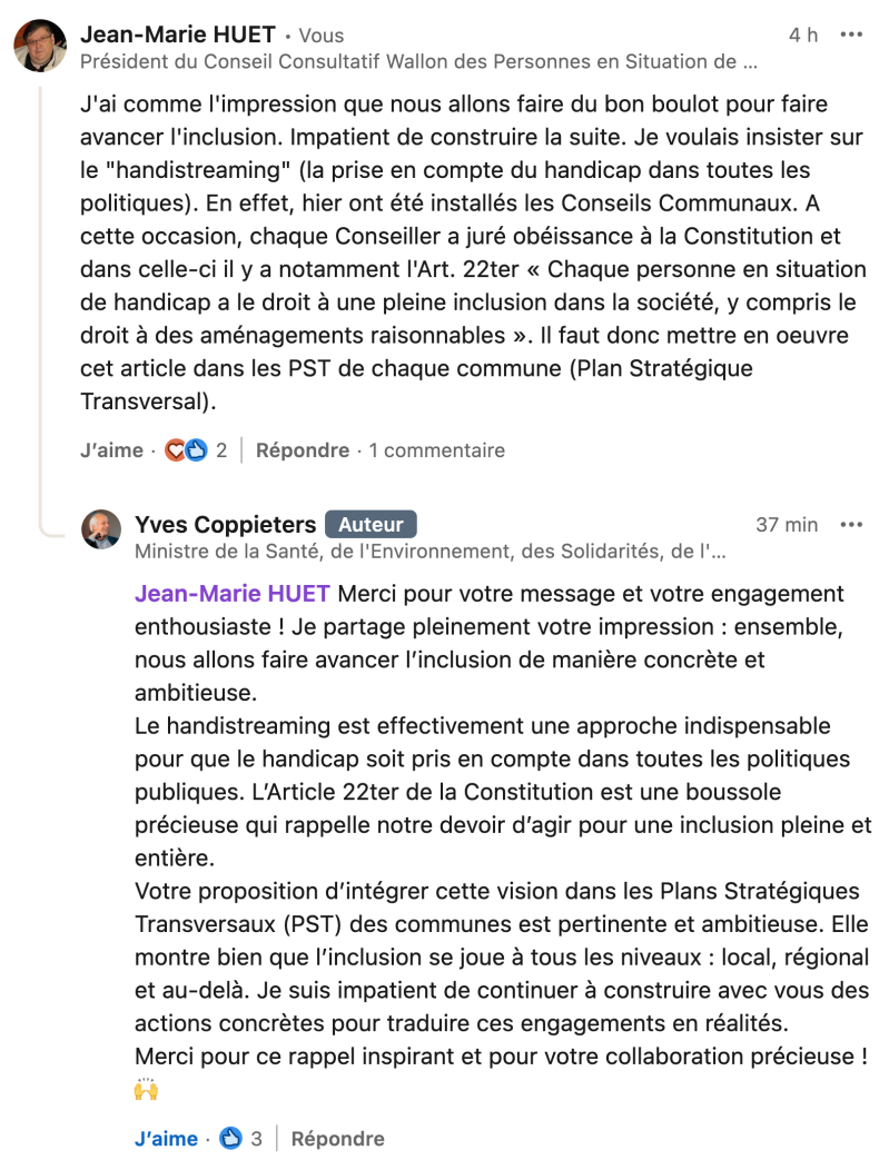La fonction de membre et d'autant plus de Président du Conseil Consultatif Louviérois de l'Inclusion des Personnes en Situation de Handicap n'est pas compatible avec mon mandat de Conseiller Communal. J'ai donc envoyé ma démission au Collège et au Conseil. Je continuerai à suivre les travaux du Conseil en tant qu'observateur attentif pour le PS.