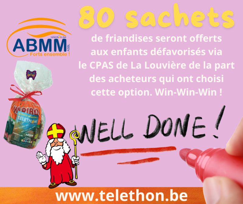 Via l'action de récolte de fonds de "mon" association l'ABMM nous avons pu offrir aux enfants défavorisés via le CPAS de La Louvière 80 sachets (350 gr/p) de friandises pour la Saint-Nicolas.